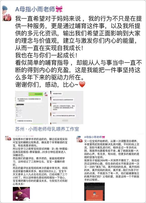 哺乳指导是一个综合性的工作,她们本身也是哺乳妈妈,她们希望更多妈妈能够享受到哺乳的乐趣,实现亲密并且科学的育儿,甚至邀请全家人一起参与,因为她们坚信,哺乳不仅仅是妈妈一个人的事情,需要全家人一起努力。