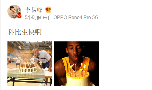 8月23日是已逝NBA传奇球星科比的42岁生日,李易峰特意在洛杉矶时间0点发文祝偶像生日快乐。作为科比多年铁粉,李易峰曾在直播中说手机里最不想删除的就是和科比的合照。