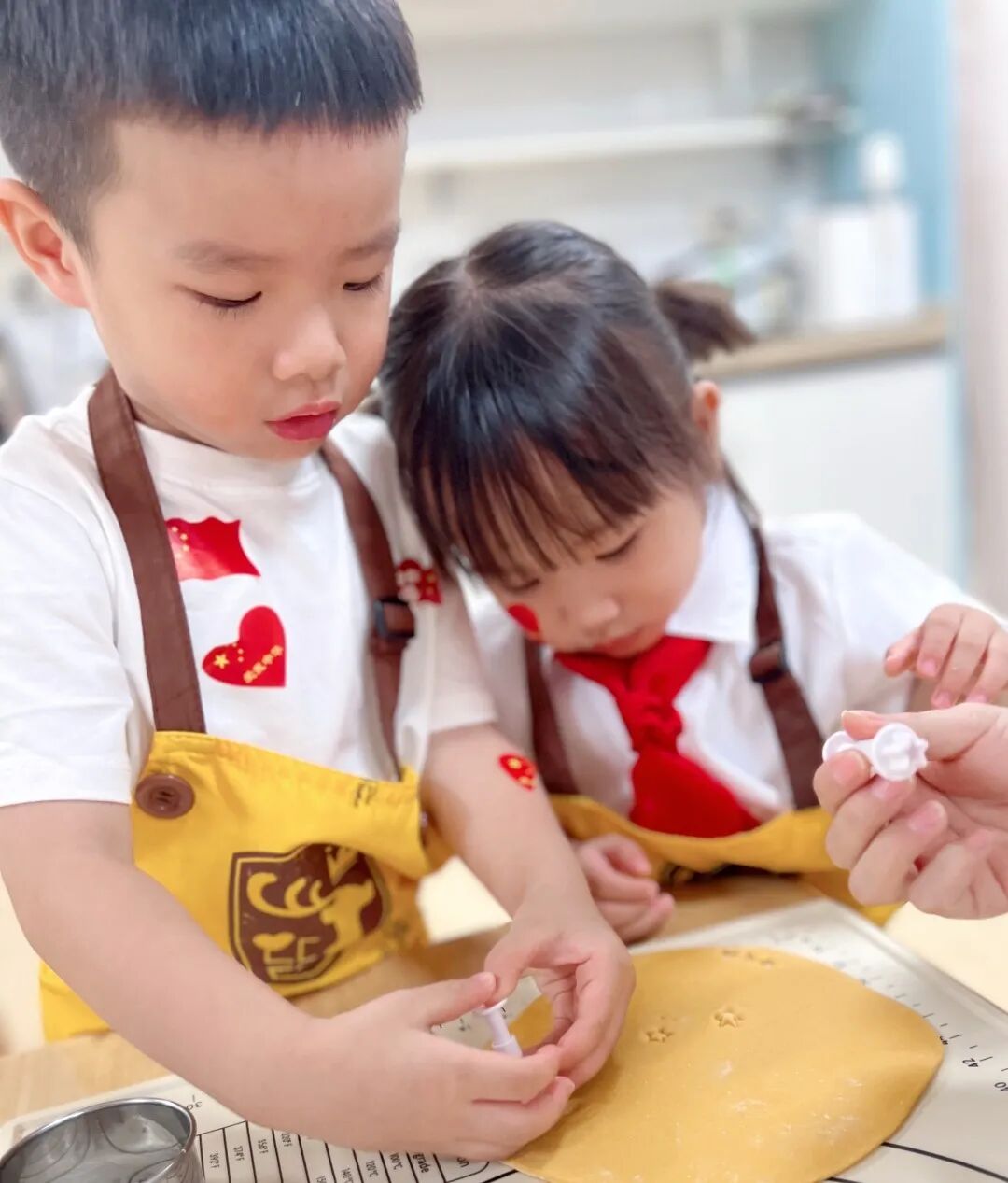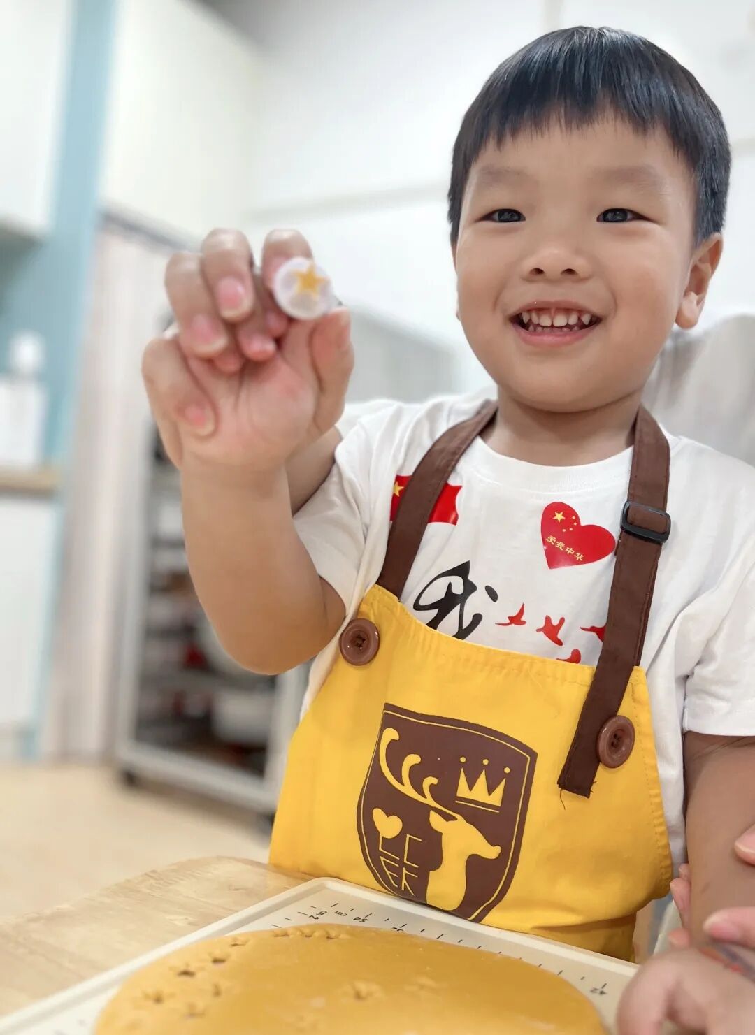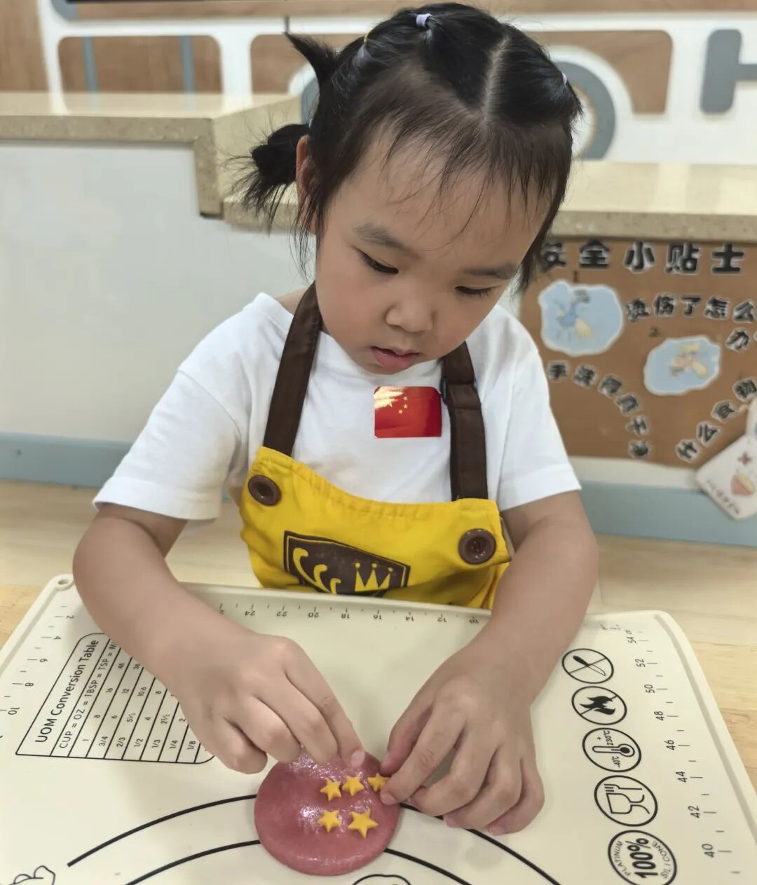 系上小围裙变身小小烘焙师。揉面团、压模具,将国旗上每颗星星的意义牢记在心中。