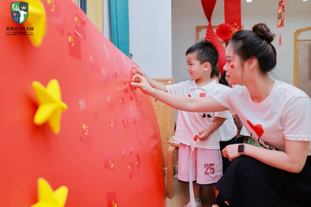 “国旗是什么颜色呀?”“星星代表什么呢?”在问答游戏里,小鹿们分组拼国旗拼图,还用模具拓印五角星,送给小伙伴时不忘说:“我们要像星星一样团结!”
