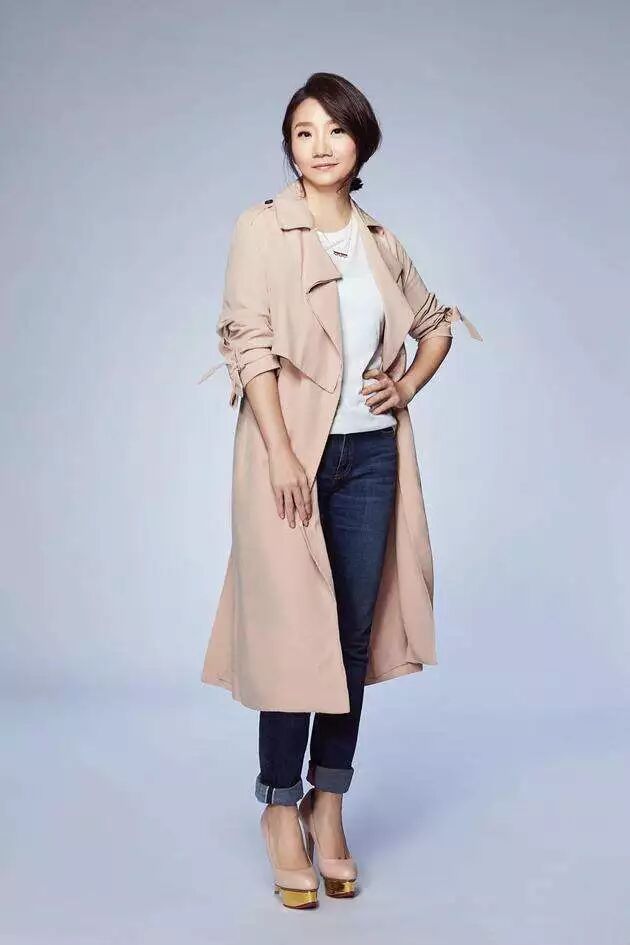陶晶莹内搭白色纯色T恤,下身搭配蓝色修身牛仔裤,利落又简约。外套一件裸粉色风衣外套,既温柔又随性。脚上穿着一双裸粉色鞋面和金色防水台的高跟鞋,裸粉色跟风衣的颜色相呼应,充满女人味,而金色又是一个细节亮点,增添了时尚的张力。整套穿搭既优雅又有休闲感,尽显轻熟女性的知性气质。