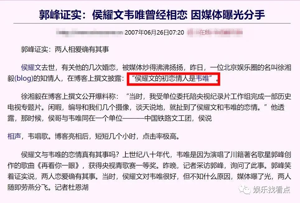 2007年,又有人爆料说,韦唯与相声大师侯耀文在一起过,并说韦唯是侯耀文的初恋情人。对于这个爆料,韦唯本人并没有回应。倒是歌手郭峰跑出来说,两人恋爱确有其事。当时,侯耀文对韦唯非常好,但不知道什么原因,两人很快分手了。