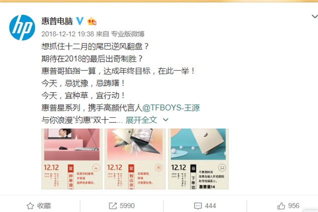 显然王源就又没做到这一点,前段时间,身为惠普电脑代言人的王源发了一条微博,配图是苹果的笔记本电脑。