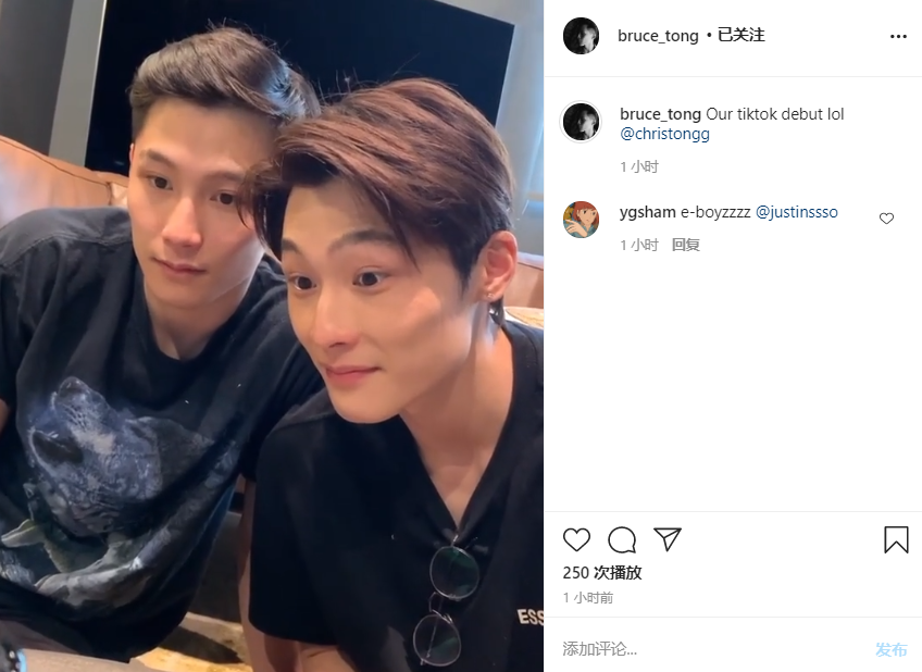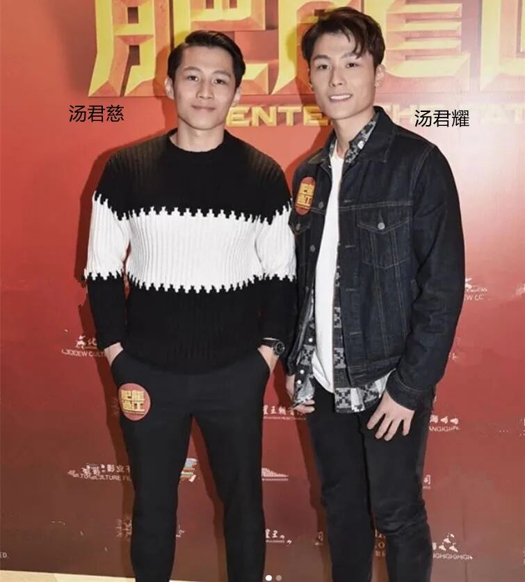 尽管兄弟俩长得非常像,但仔细一看,还是能分辨出来的。穿黑色印花T恤,梳着大背头的是哥哥汤君慈。相较于弟弟,他无论是衣着风格还是神态,都比较成熟。