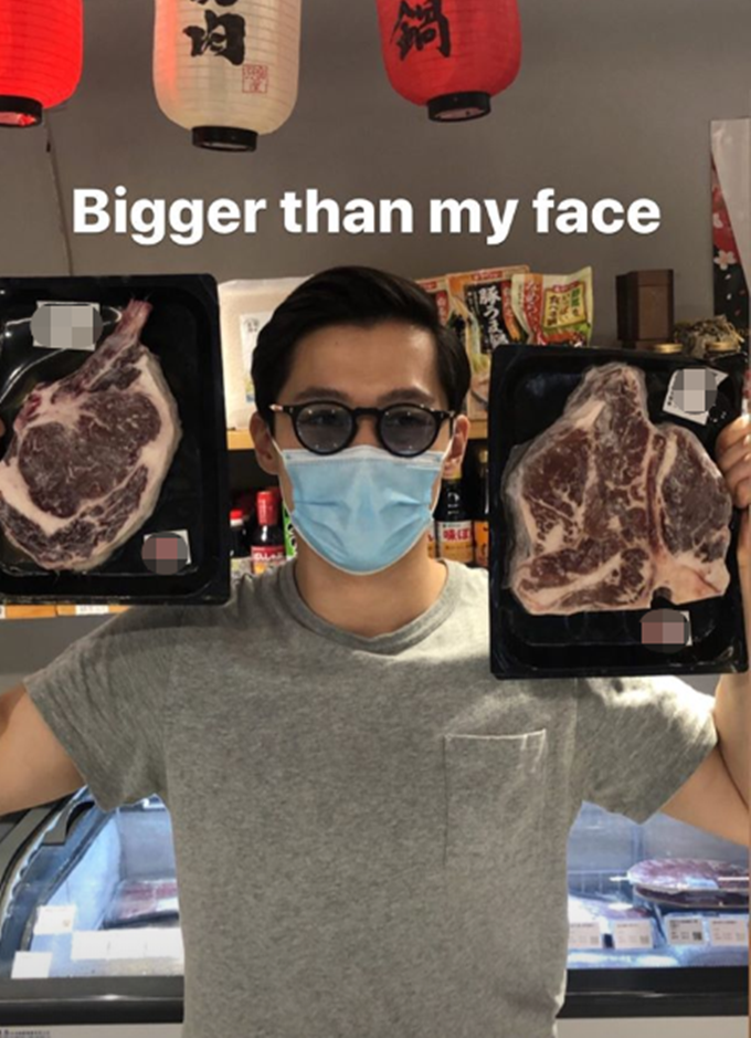 另一张照片中,汤君慈包得严严实实的出镜,他手上拿着一块肉,并留言称:比脸还大。