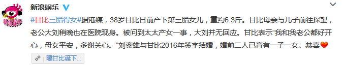 新浪娱乐:38岁甘比日前产下第三胎女儿,重约6.3斤。甘比母亲与儿子前往探望,老公大刘稍晚也在医院现身。被问到太太产女一事,大刘并无回应。甘比表示“我和我老公都好开心,母女平安,多谢关心。”
