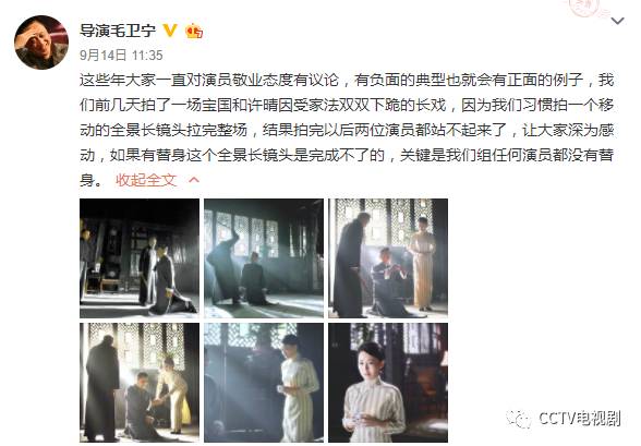 毛卫宁配图中的这场戏,拍的是陈宝国和许晴因受家法双双下跪的长镜头。因为要拍一个移动的全景长镜头拉完整场,所需时间较长,如果用替身,这一移动的长镜头将无法实现。于是,61岁的陈宝国和搭档许晴就这么一直跪着。等这场戏拍完,他俩跪得都站不起来了。