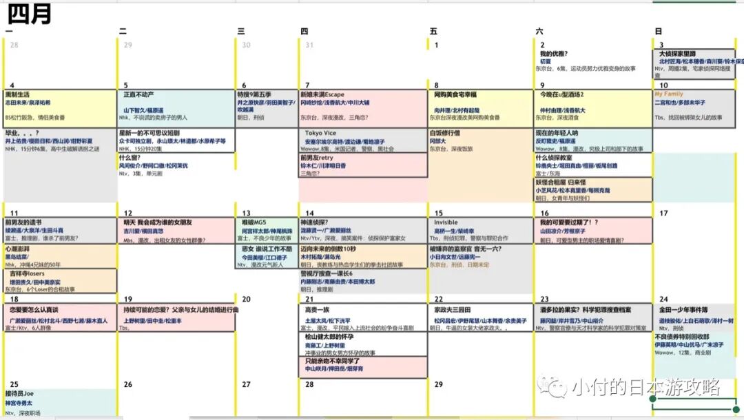 日剧日历(粗框的是有熟肉的。颜色分类:粉红是爱情类,蓝色是职场搞奋斗事业型(医疗啊,教师都放进去了),黄色美食,灰色案件刑侦恐怖悬疑,橘色是生活日常人际交往类。没确定的就没标色。如果背景不够,可能还会加字体颜色。之前一篇21秋季日剧10:相叶雅纪/佐佐木藏之介《和田家的男人们》和分类排名的开头有比较详细讲过怎么找熟肉看了,大家可以去看,我不重新贴了,还是懒或者找不到的,可以来问我。要给我点在看嗷!大部分跟“豆瓣”复核过,或者是字幕组的剧名。有的找不到中文是直接搬的日文/英文。然后,朝日台的官网我这里没办法看日剧的内容,所以未出的新剧可能没有他家的。