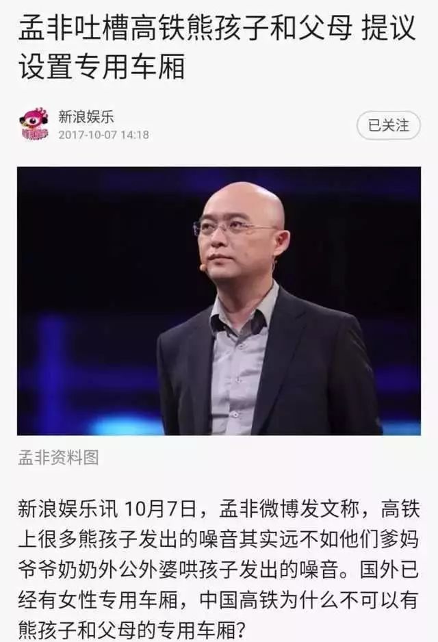 前几天,孟非乘坐高铁时被熊孩子及其家长吵烦了,怒发微博建议设置专用车厢。此言论一出,立刻引来无数网友围观,大家观点两边倒。不知你怎么看呢?