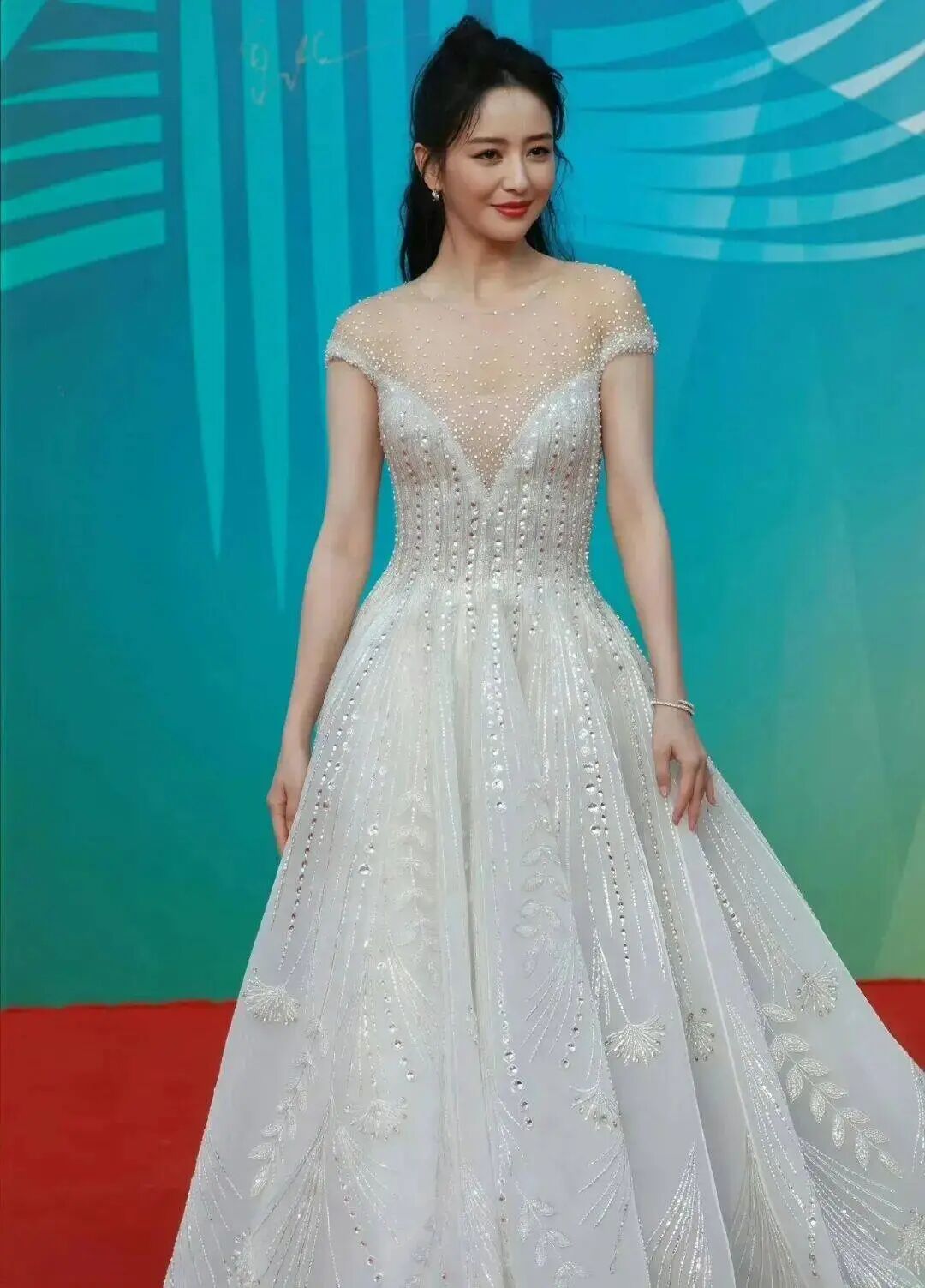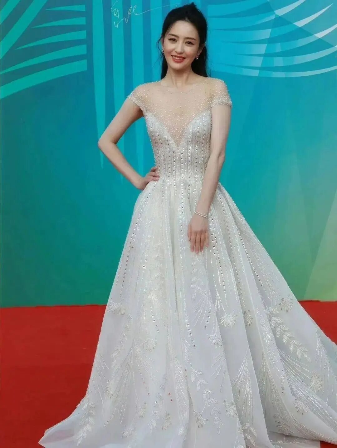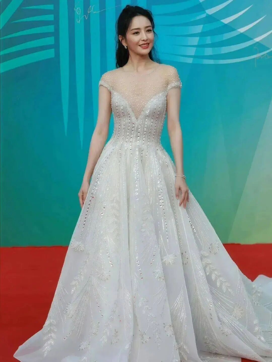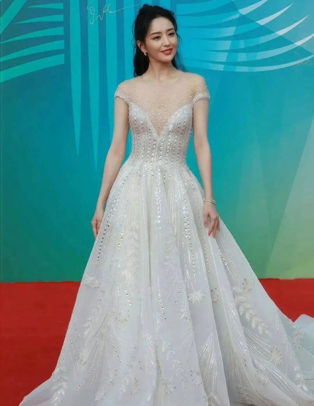 深V礼服几乎延伸至肚脐,轻薄的肉色薄纱上点缀着珍珠,如同夜空中散落的星辰。佟丽娅以自信坦然的气场驾驭这身大胆剪裁,在红毯上书写了一段关于优雅与东方气质的完美注脚。