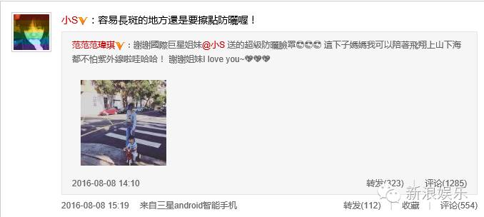 小S转发范玮琪这条微博的时候还特意提醒范玮琪要擦点防晒。
