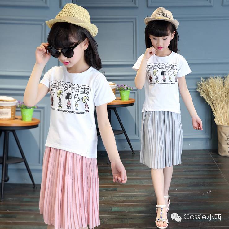 【5月2日新品】女童T恤+百褶裙套装,100cm-150cm可穿,两色可选,内部价40元。