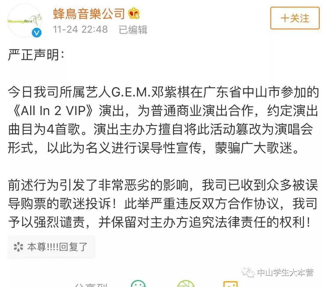 随后邓紫棋公司也立刻发表声明