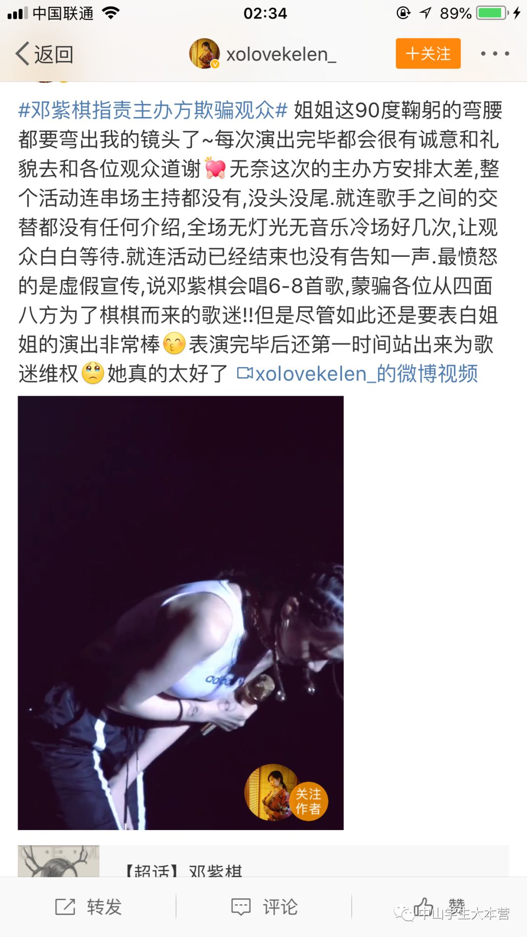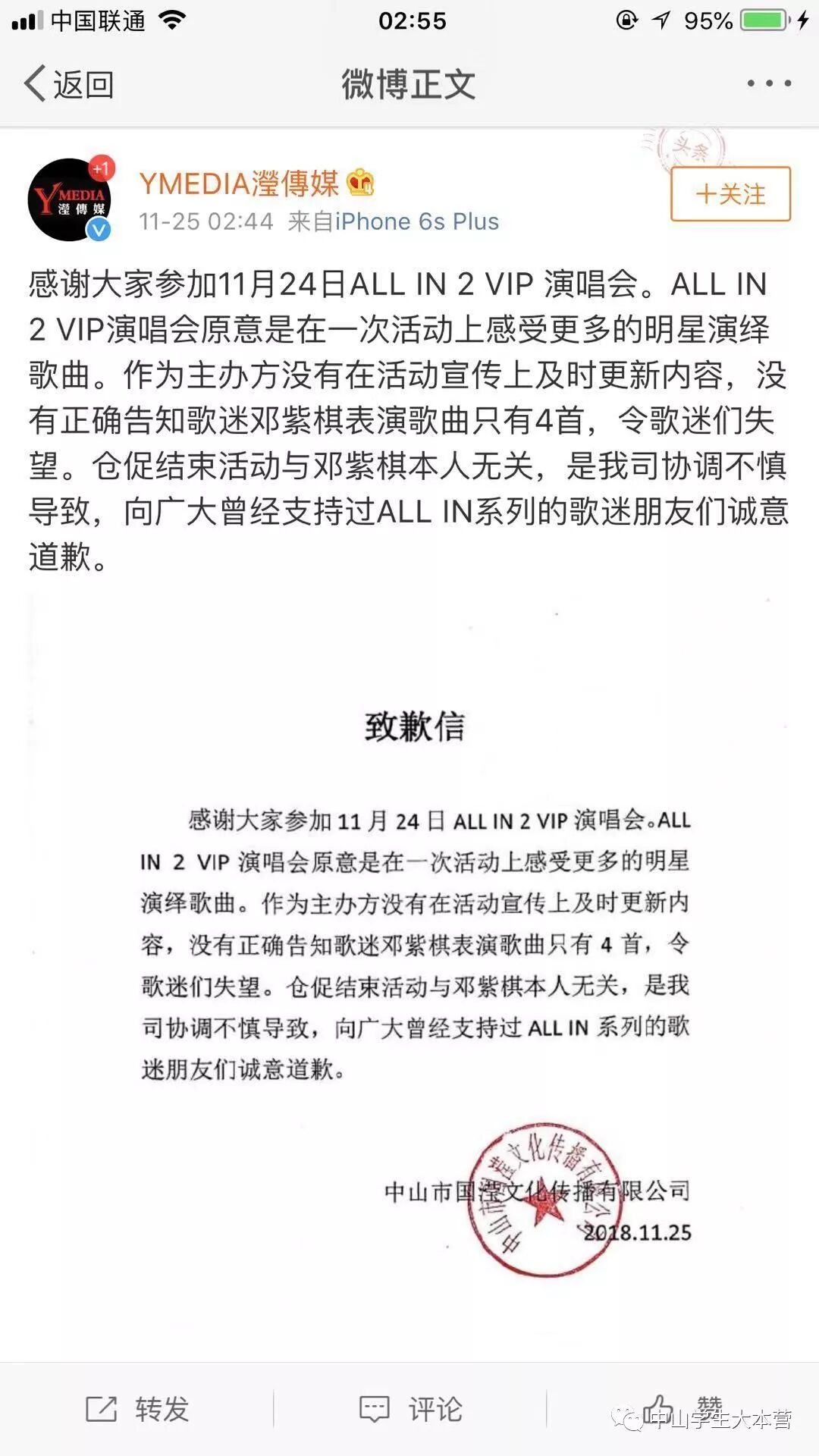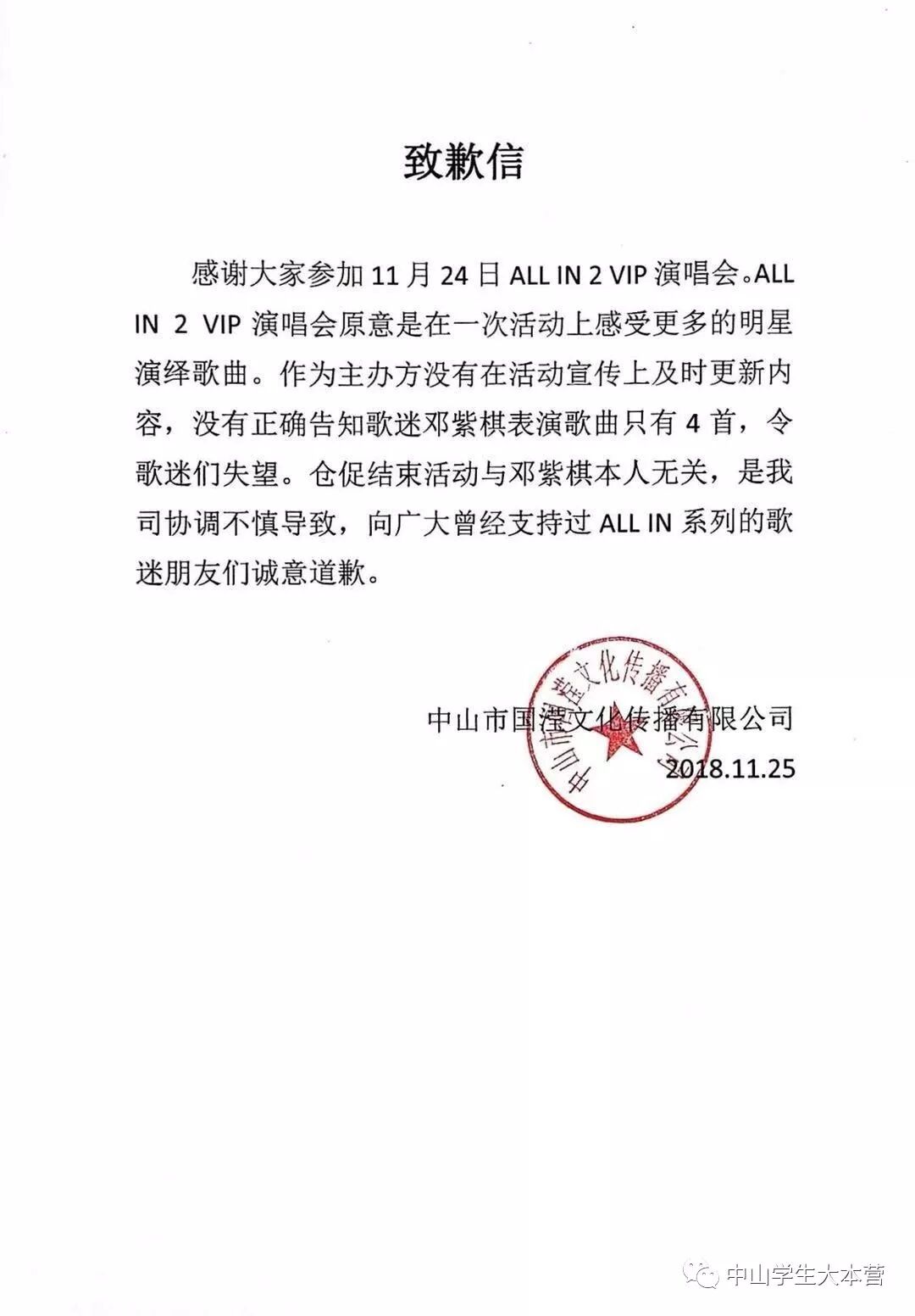 凌晨2点44分该主办方在微博发出致歉信