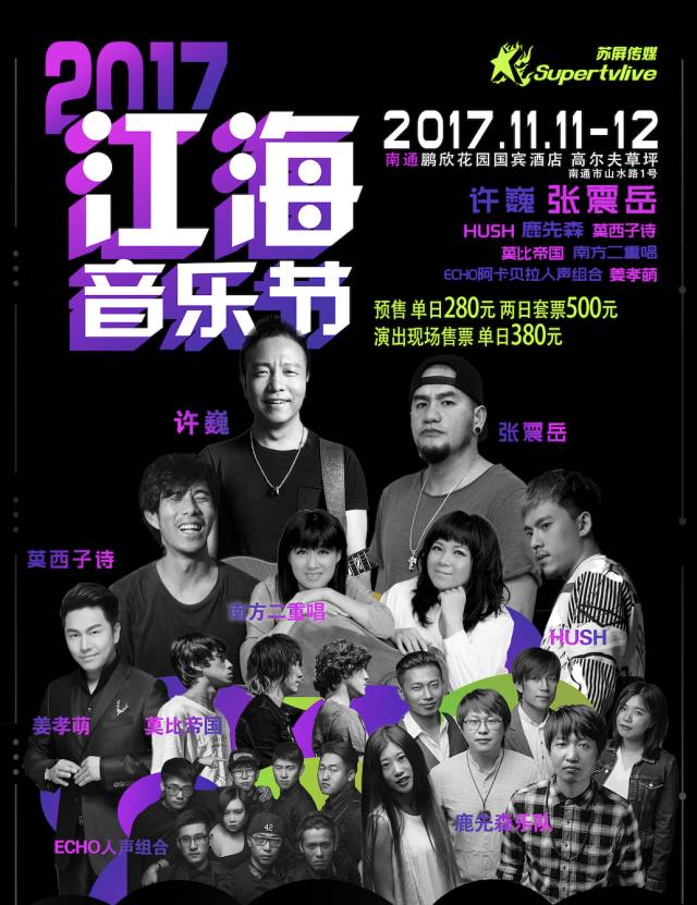江海音乐节为您邀请了春风十里鹿先森,蓝莲花许巍,还有差不多先生嘻哈导师张震岳,不要问我过得好不好南方二重唱,莫西子诗,HUSH,青奥歌王姜孝萌,ECHO人声组合、莫比帝国,都是您耳熟能详的歌手,终于可以在家门口一睹风采了!