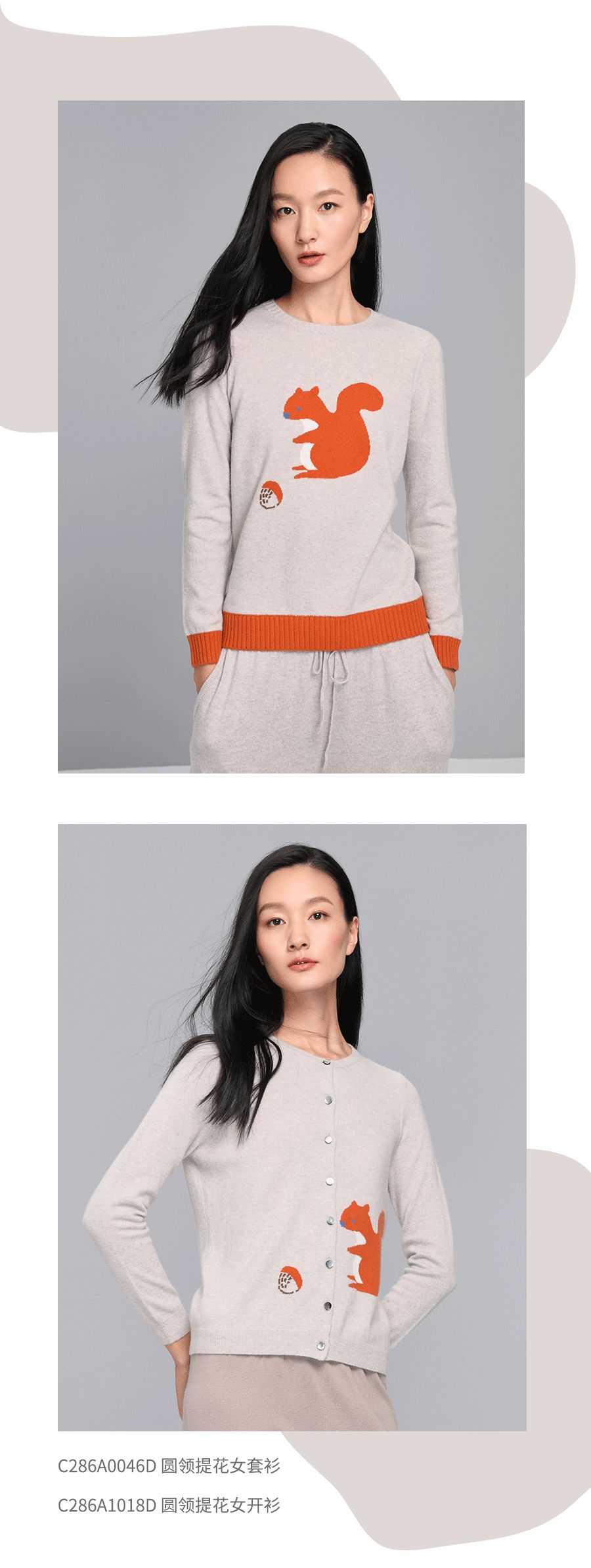 除了忙碌觅食的松鼠妈妈,正在嬉戏的松鼠宝宝也成为了这部寻果记中的主角。同系列童装由贝儿、小叶子演绎出别样双生感,以提花工艺织就饱满松鼠图案,感触柔暖羊绒之余更添一份稚趣细节。