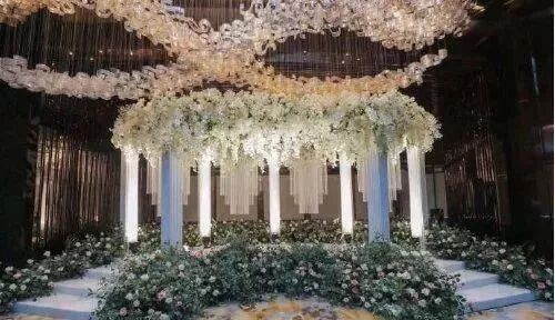 婚宴现场婚宴现场白色系花束和珠帘相得益彰,非常的浪漫了,会场上还装饰有一对新人的卡通画像和婚纱照。