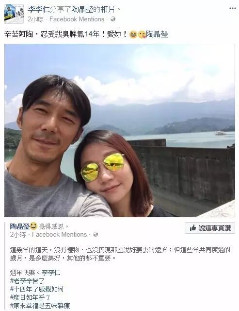 李李仁也转分享老婆的发文说:辛苦阿陶,忍受我臭脾气14年!爱妳!隔空晒幸福,让网友们纷纷回应幸福就是… 你在身边,岁月静好、对的人,就是风景,就是幸福的、太闪了、柴米油盐酱醋茶这样子最幸福、陶子,要继续幸福哦。另外,对面网友留言表示我们也是9月11日结婚纪念日,陶晶莹也亲自回覆祝福好好过日子、祝福无限。