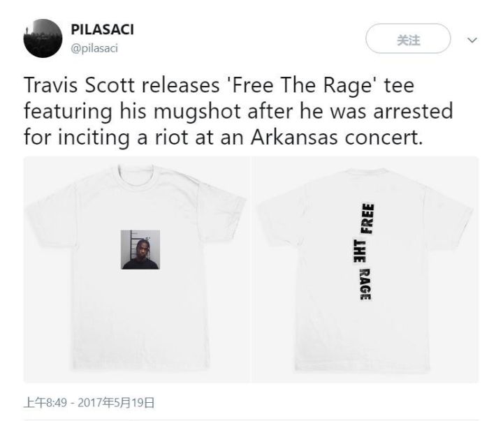 TS也很擅长制造潮流,在今年5月他因为在演唱会上鼓励粉丝冲上舞台而遭到逮捕,TS被指控煽动暴乱、扰乱治安、危害未成年人权益。随后他将自己被逮捕的照片贴在T恤上销售,背面写了Free the Rage(免费的愤怒)。