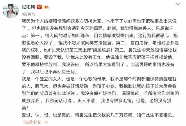 1月6日,袁巴元发文承认与张雨绮离婚后又在一起生活,并爆料女方与刚认识两天男子开房,表示这也是两人之前离婚的原因,并强调二人已没有感情上的关系。稍晚,张雨绮对此事做出回应:自由之身,与谁约会都是我的权利,但“头天认识第二天上床”纯属虚构。同时,张雨绮向袁巴元喊话:“请袁先生把欠我的几千万还我,咱们此生不复相见”。张雨绮回应3个小时后,袁巴元再发长文:既然张雨绮有新的男友,那孩子就交由自己抚养,那5000万是抚养费,并不是欠款,如果是欠款,请张雨绮公布证据。如今两人这段过去婚姻的纠缠,真可谓是“剪不断。
