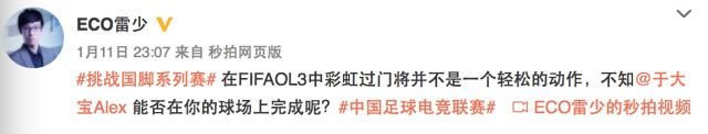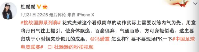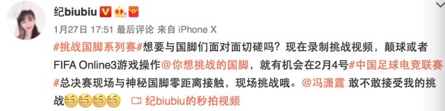 原来是国脚郑铮在微博上发起了#挑战国脚系列赛#的活动。铮哥通过视频喊话让大家尽管放马过来。