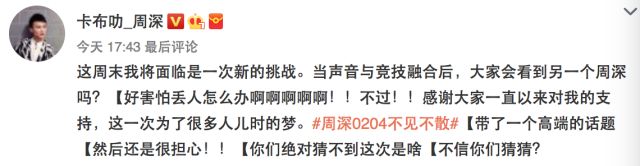 最近人气歌手周深的一条微博#周深0204不见不散#在话题榜上热度非凡。周深透露自己将面临一次全新挑战,而且非常紧张。
