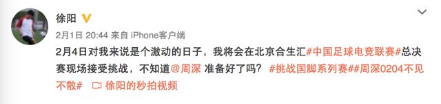 原来是周深将作为神秘嘉宾在2月4日中国足球电竞联赛总决赛现场挑战国脚徐阳,徐阳老师也不示弱,在微博上应战。