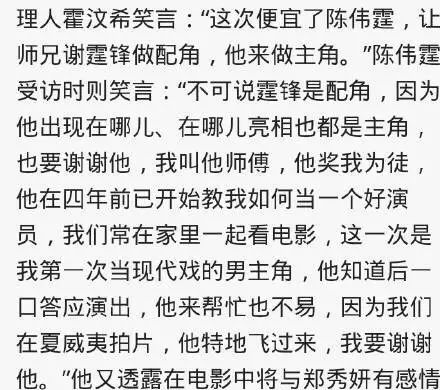 套用粉丝的心声:陈伟霆做错了什么,从头到尾都是很谦虚的态度感谢师兄,就因为经纪人的一句话就要受骂,作为粉丝,我爱豆被骂我还不能维护他,我还要去给别人说对不起陈伟霆就应该做配角不该做主演?!凭什么真的很感谢评论里理智的路人,陈伟霆真的是一个很棒的人,请大家多多支持他的作品,谢谢。