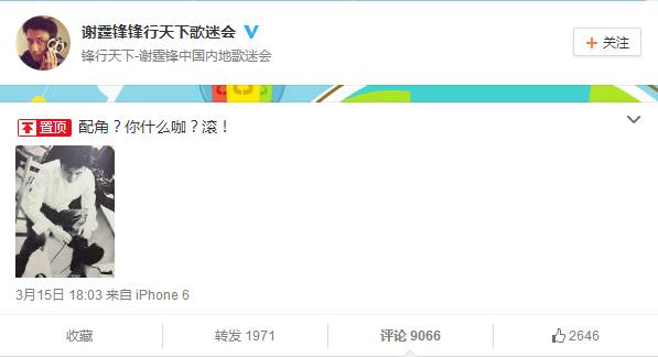 过分的是,谢霆锋歌迷会官博第一时间影射了陈伟霆,据说陈伟霆还关注了这个微博。