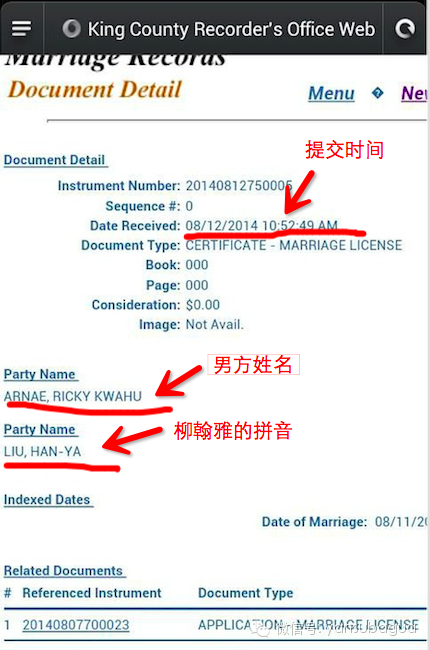昨天豆瓣某小组曝光了疑似阿雅(本名柳翰雅)在美国登记结婚的公开资料