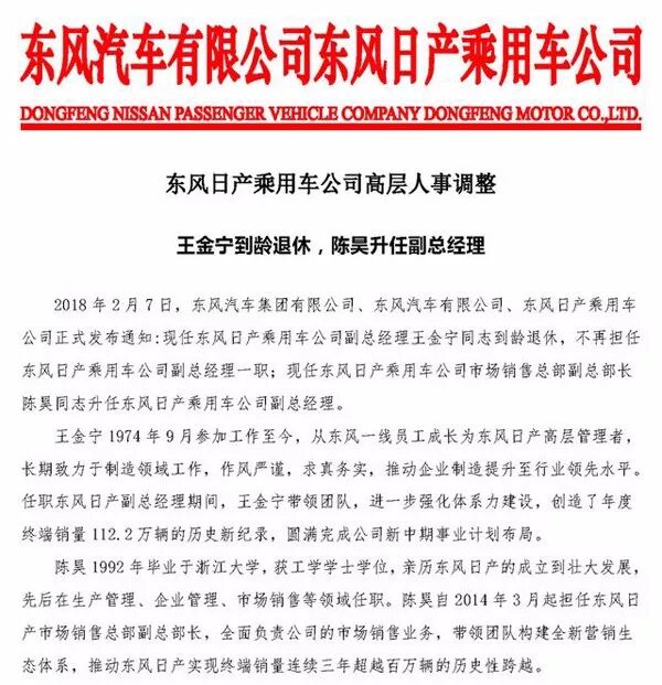 ►2月7日,有关车企“华南虎”东风日产的一则人事变动传来,现任东风日产乘用车公司副总经理王金宁退休,不再担任东风日产乘用车公司副总经理,现任市场销售总部副总部长陈昊升任副总经理。