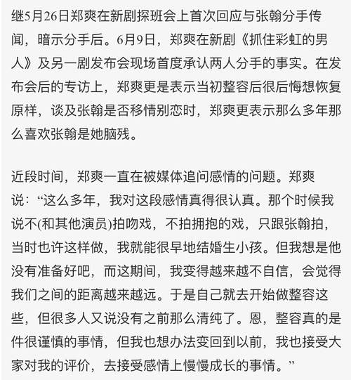 按照郑爽方面所说,俩人是2014年8月份相识,不过郑爽15年6月份采访时却并且大谈对张翰的痴情,只和张翰拍吻戏??自卑所以是整容?还表示目前在空窗期。