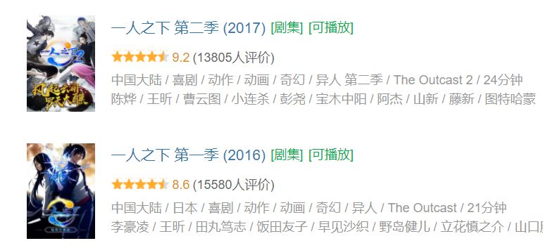 2015年2月26日,热血漫画《一人之下》开始在腾讯动漫上连载,2016年7月改编为动画,一经播出就受到了二次元用户的强烈追捧, 第一季第二季的播放量突破30亿。目前动画版《一人之下》第一季和第二季在豆瓣上的评分分别为8.6和9.2分,授予“第一国漫”的称号当之无愧。
