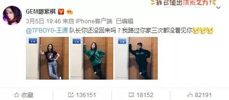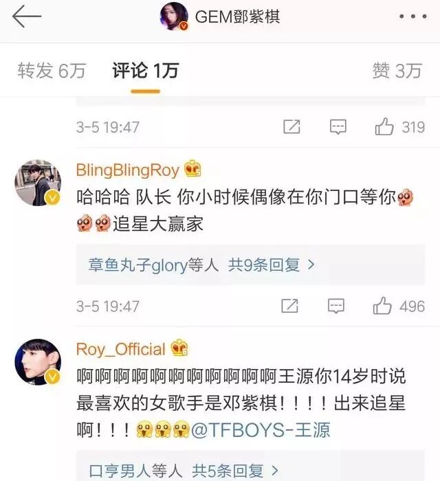 粉丝也在评论里喊话王源“偶像在门口等你,王源真是追星大赢家!”王源曾在14岁的时候说过自己最喜欢的女歌手是邓紫棋