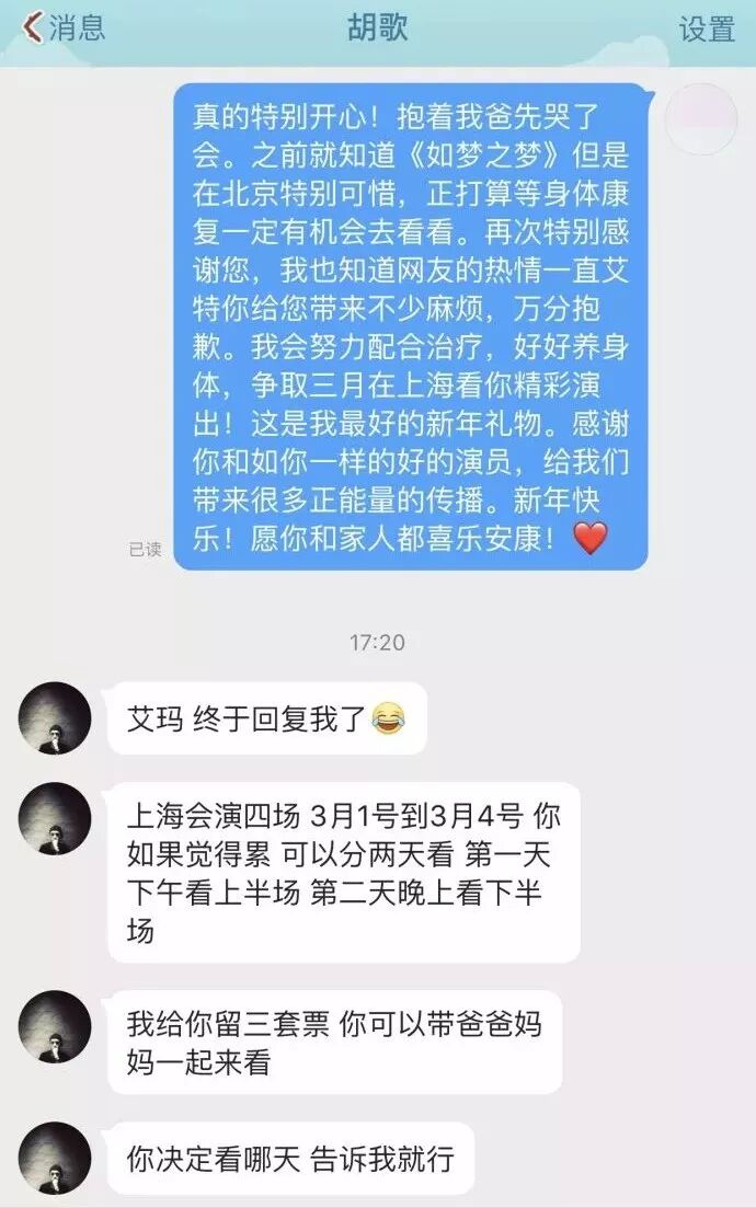 2017年末,患有白血病的女生曾给她的偶像胡歌发私信表示:是他饰演的角色陪伴自己度过与病魔抗争的阶段。万万没想到,胡歌本人不仅回复了这条私信,还赠送了自己出演的话剧《如梦之梦》的门票
