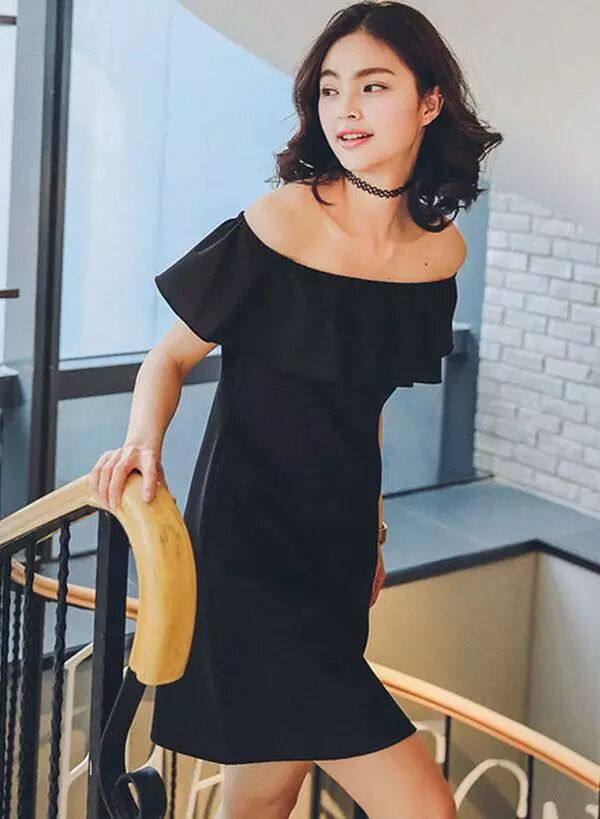 黑色的连衣裙总是给人一种典雅内敛的成稳范,在一字领的与荷叶边的诠释下,增添了甜美与女人味。