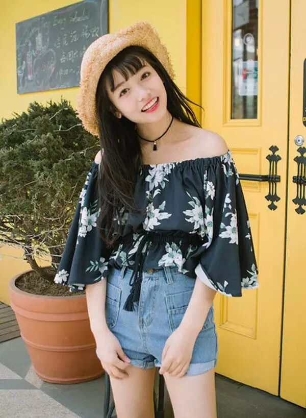 浅蓝色带点皱褶花边的一字领显得甜美可爱,而且透出点小性感,搭配的阔腿牛仔裤,破洞的效果又展现出率性随意的闲适范。