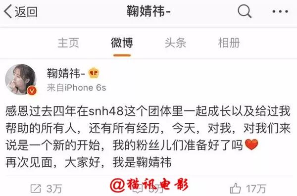 2016年12月,鞠婧祎宣布脱离snh48独立发展, 还是属于丝芭的艺人,未来走更高大上的影视、歌手路线,看样子是要往流量小花的路线捧了。