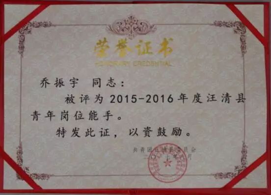我院团总支副书记、太平村驻村第一书记乔振宇,被共青团汪清县委员会授予“2015-2016年度汪清县青年岗位能手”荣誉称号。