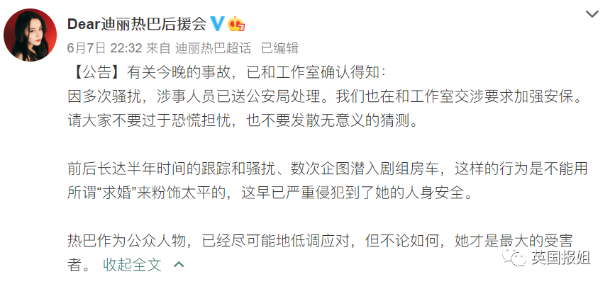 想象一下我们生活中如果有一个陌生人时刻尾随你是多么吓人的事吧。就像热巴官方的公告中说的,这样长期的骚扰已经不可以用“求婚”二字来粉饰太平,因此也将他交给了警方。