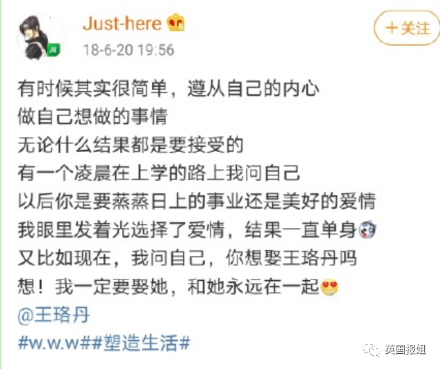 他的微博上记录了很多给女明星的留言,其中就提到自己一定要娶迪丽热巴。