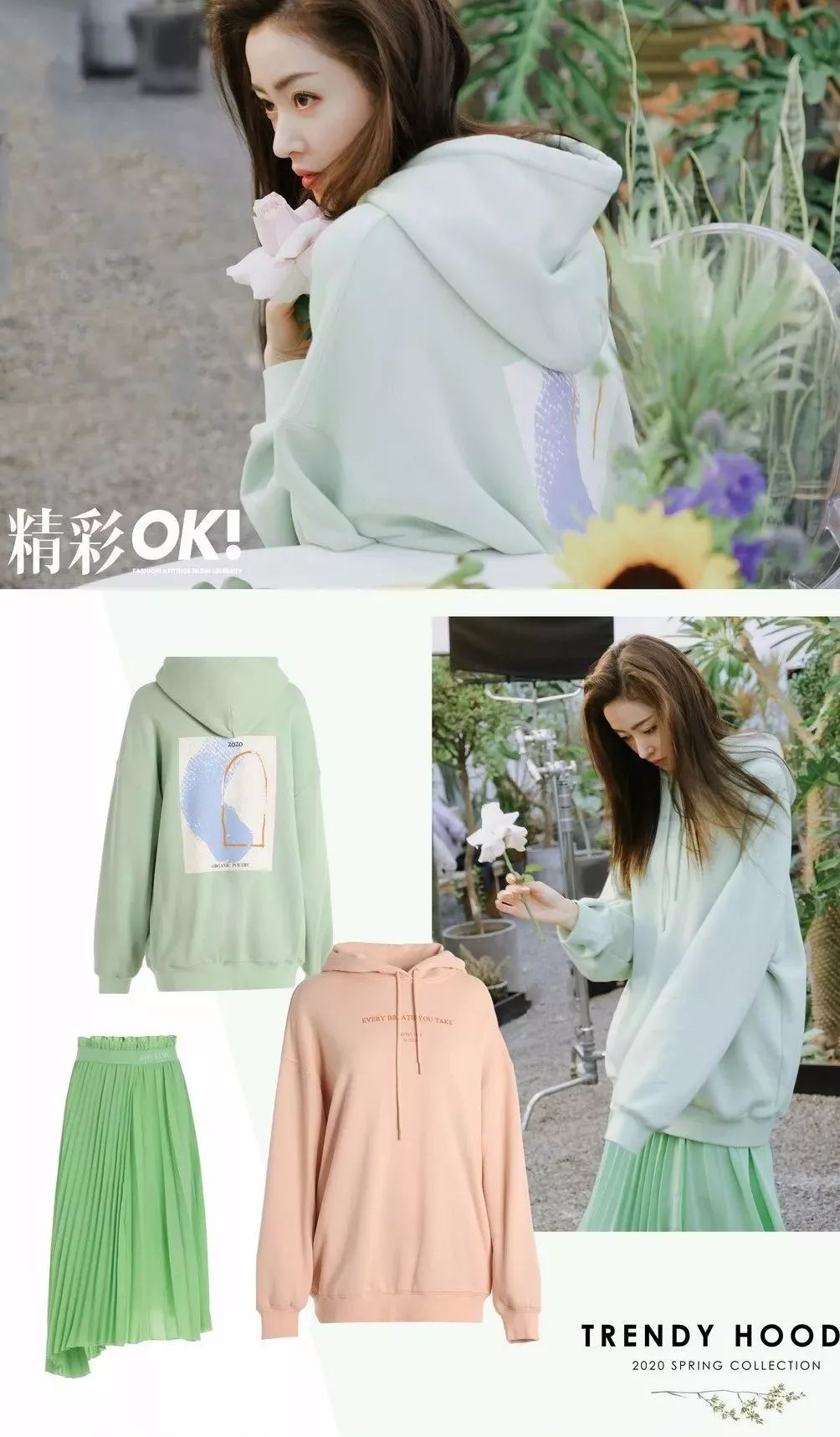 张天爱用oversize帽衫搭配同色系百褶裙,上下宽松的造型看起来很有个性,不同材质碰撞制造层次,身后的趣味涂鸦,又在朝气蓬勃中为活力加持。