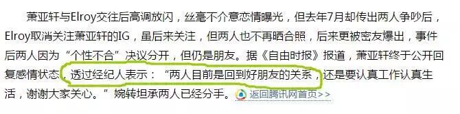 承认分手时萧亚轩透过经纪人说了一句:“两人回到好朋友的关系”,神马是“前任的自我修养”,萧亚轩一直做出了最优雅的示范。