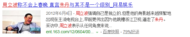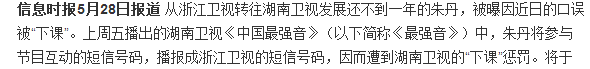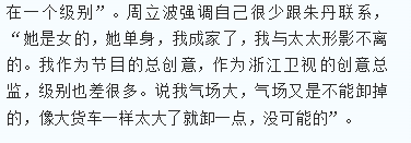而此时浙江台对周立波颇为器重,不但没有削弱周立波的节目导师特权,还为其开辟了立波秀。尴尬的朱丹只好以发展受限,不够自由,内心自卑等这种明眼人一看就知道的借口请辞浙江台。