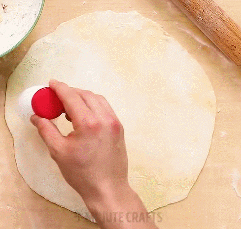 然后,在撵好的大面饼上,像盖章一样,即可迅速戳出数十个大小一致的饺子皮,个个形状规整,比机器压出来的饺子皮还漂亮!