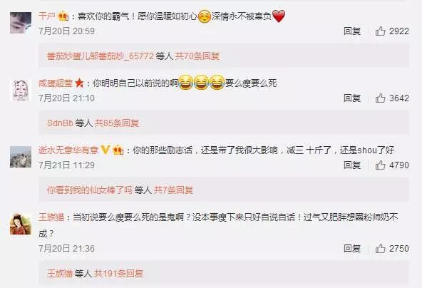 “当初说要么瘦要么死的是鬼啊?没本事瘦下来只好自说自话!过气又肥胖还想圈粉不成?”