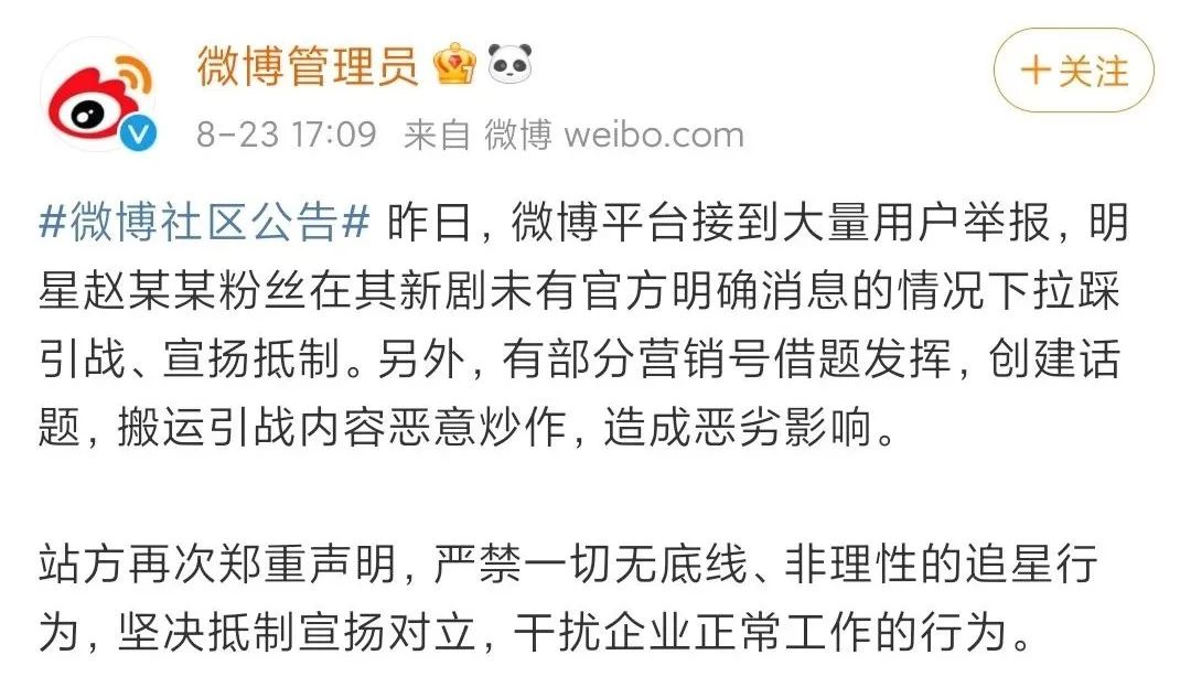 23号下午,微博管理员发文,以不点名的方式,批评了赵某某粉丝“拉踩引战”的不良行为,以及营销号借题发挥的恶劣举动。
