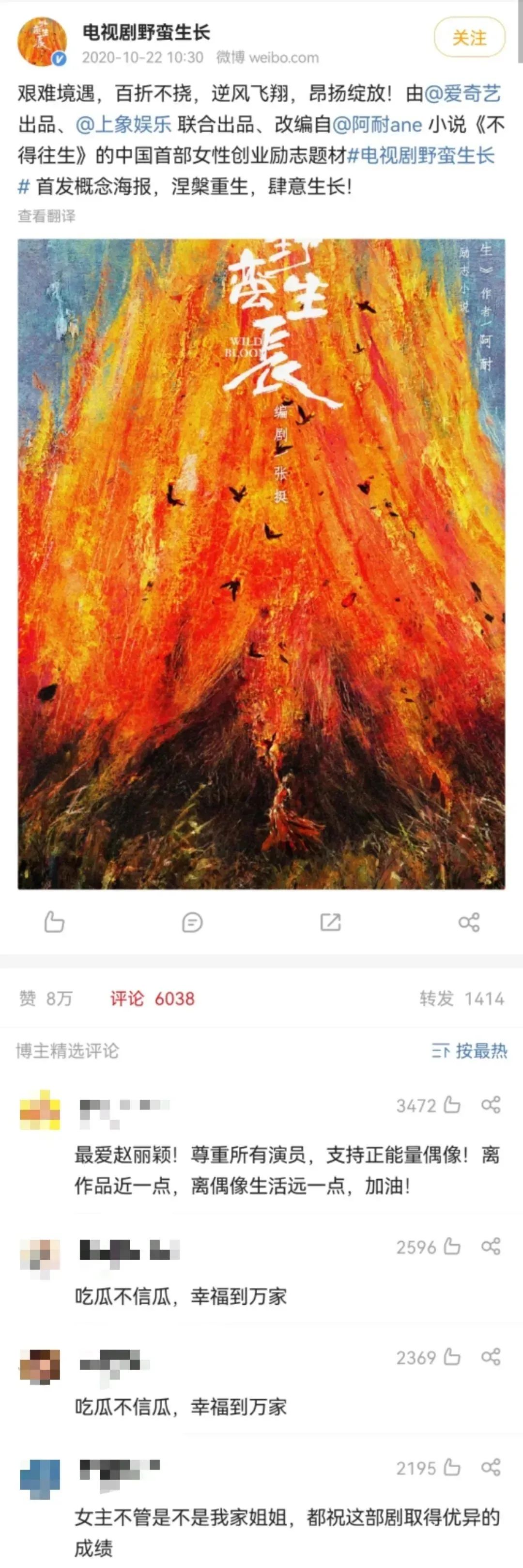 而且,本来这则消息就是营销号发出来的,粉丝们却偏偏跑到了“电视剧野蛮生长”官方微博下边留言:非官宣,不约。