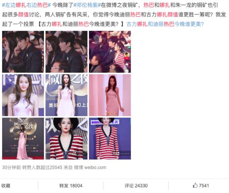 按理说这是多么赏心悦目的画面,就这张照片儿我眼珠子在仨人身上转一百圈儿都不厌倦,结果不知道哪位网友发起投票问,娜扎和热巴哪个更美?