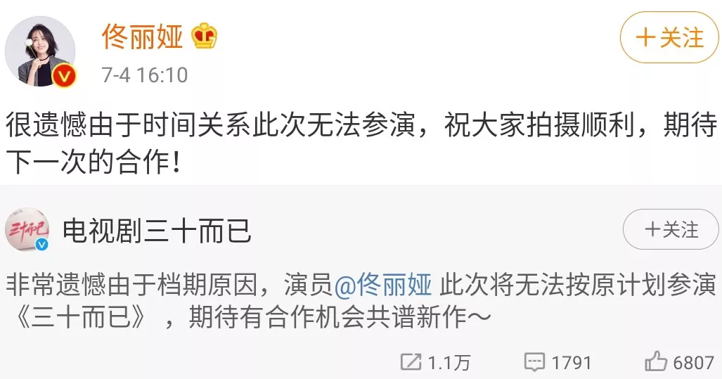 随后,佟丽娅宣布辞演《三十而已》的顾佳一角,理由是档期原因。